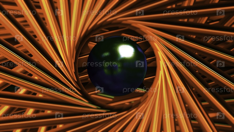 Шарик в вращающейся 3D спирали из металлических линий. Движение. 3D-анимация с блестящим шаром в центре вращающихся линий. Линии движутся в спиральной раме, шар в центре