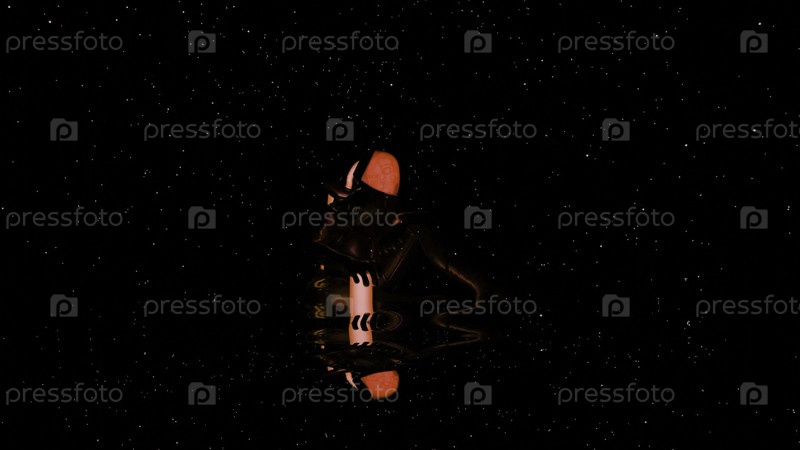 Футуристическое 3D устройство светит в темноте. Дизайн. Устрашающий светящийся объект в тёмном пространстве с комарами. Космическое биологическое творение освещается летающими частицами