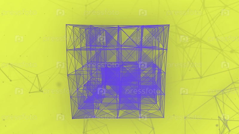 Трансформация силуэта 3D-куба из узких линий и точек. Движение. Абстрактная геометрическая фигура плетения на красочном фоне