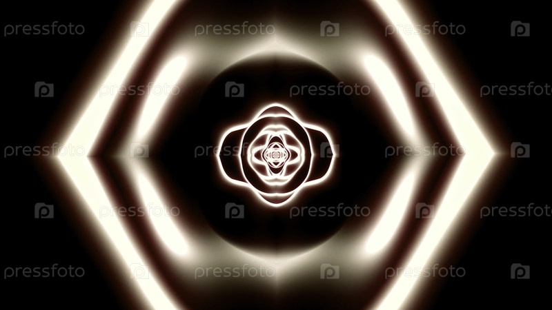 Абстрактные светящиеся медитативные кольцевые формы на черном фоне. Дизайн. Неоновый сияющий коридор