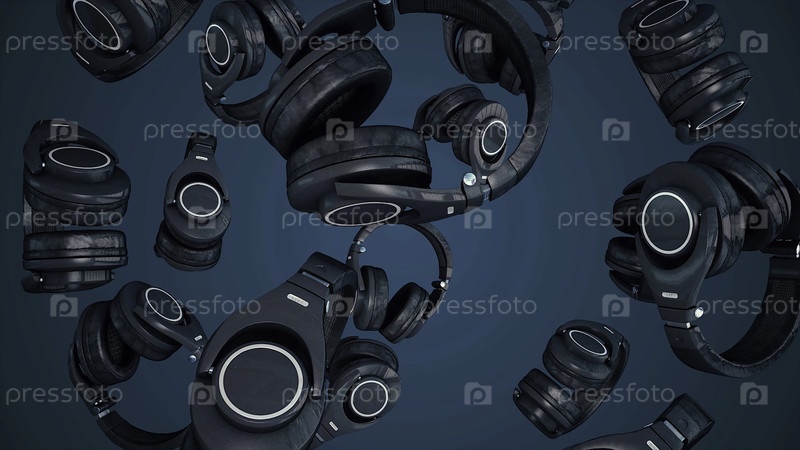 3D иллюстрация вращающиеся наушники. серые наушники, изолированные на цветном фоне. падающие наушники