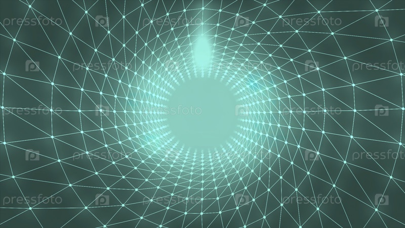 Абстрактный бирюзовый круговой коридор с узкими линиями, соединенными белыми.Движение.Свет в конце тоннеля