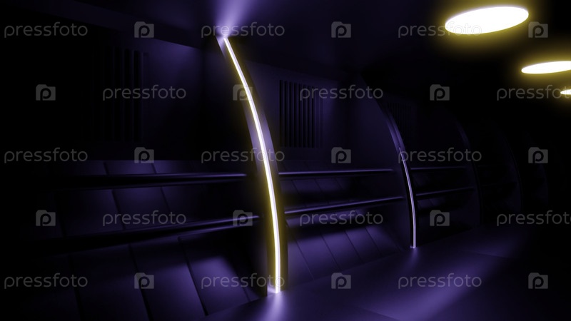 Футуристический интерьер коридора космического корабля с огнями.Дизайн.Перемещение внутри темного интерьера космического самолета