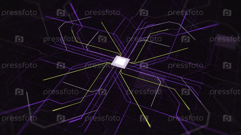 Абстрактная электронная схема для распределения электроэнергии в городской среде.Анимация.Сигналы, идущие на черном фоне от центра к бокам