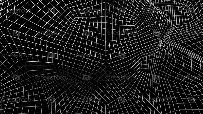 Абстрактное пространство с изогнутой 3D сеткой. Дизайн. Киберсеть с движущимися геометрическими кривыми. 3D-сетка в киберпространстве с психоделическими изгибами пространства