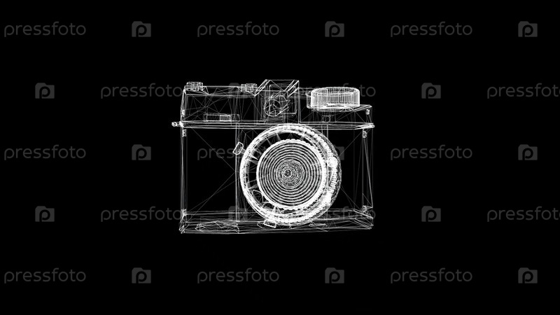 3D-модель камеры на черном фоне.Анимация.3D рентгеновское изображение Камера собирается из частиц и вращается на черном изолированном фоне.Демонстрация модели объекта