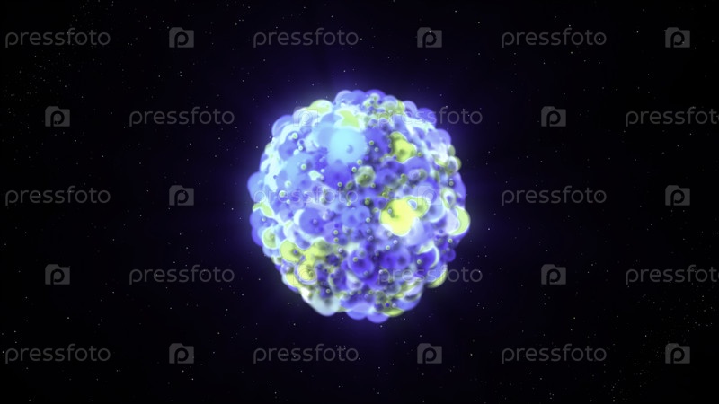 Абстрактное деление клеток в круглые 3D-шары, изолированные на черном фоне.Движение.Неизвестный 3D-объект небольших клеток