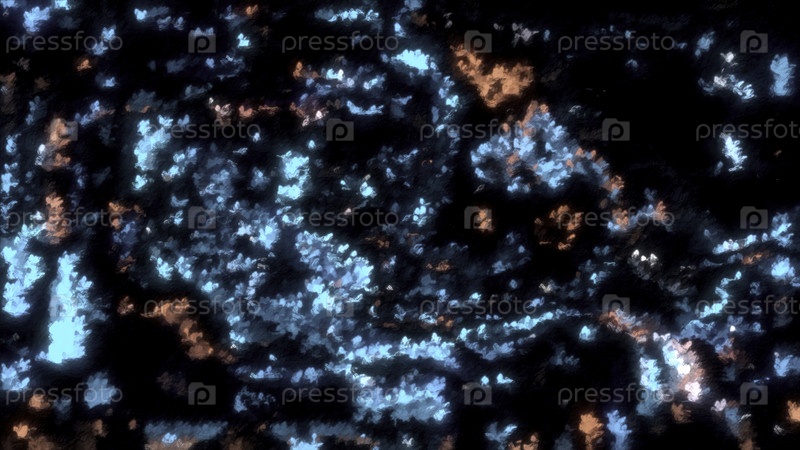 Яркие мерцающие частицы в жидком потоке. Движение. Абстрактные волнистые волны жидкости с флуоресцентными мигающими частицами. Красочные светящиеся частицы в потоке на черном фоне