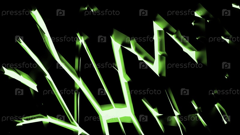 Черный фон с лазерными рисунками. Дизайн. Желто-зеленая расширяющаяся сетка, выполненная в мультфильмах и растущая вверх