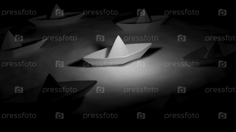 3D бумажные лодки.Дизайн.Бумажные лодки стоят в воде во тьме.3D бумажные лодки на поверхности воды в темноте