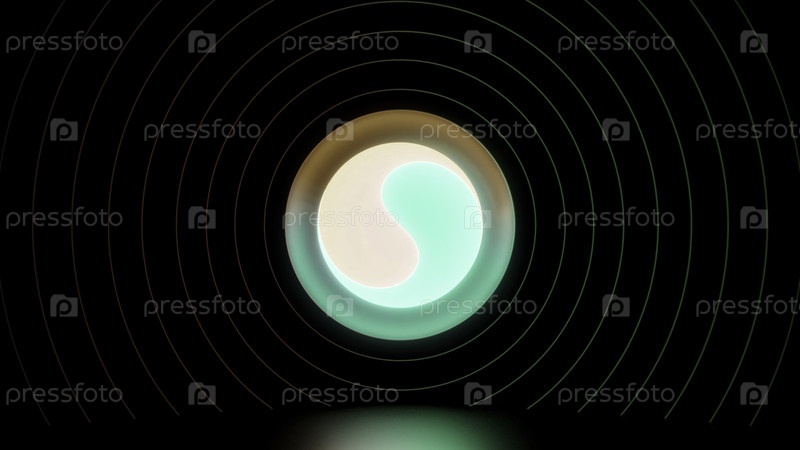Абстрактный круг инь-ян в синих, белых и красных цветах, вращающийся на черном фоне с кольцами струн. Дизайн. Оптическая иллюзия с гипнотическим эффектом