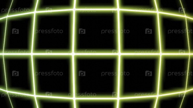 Движущаяся изогнутая неонная сетка. Дизайн. Светящаяся киберсеть движется на черном фоне. Сетка в ретро-киберпанк стиле