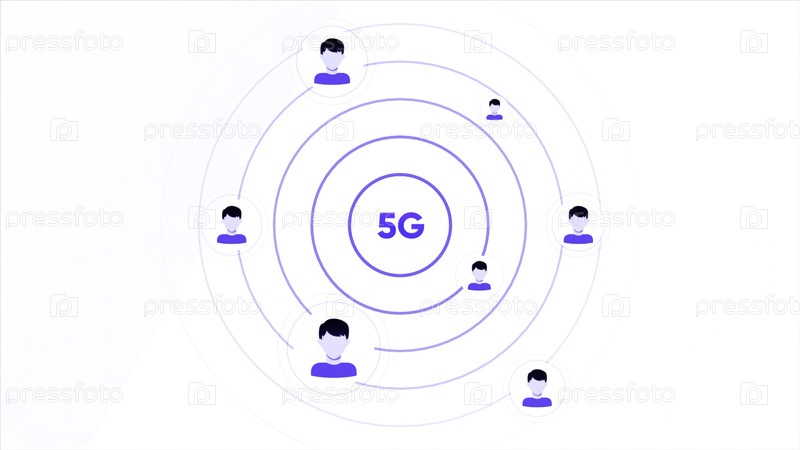 Технологический стандарт пятого поколения для широкополосных сотовых сетей.Движение.Сигнал распространения 5G и значки людей на белом фоне