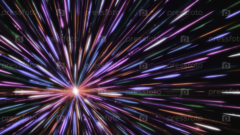 Линии излучаются от яркой точки. Анимация. Красивая яркая точка испускает многоцветные лучи света. Цветовые лучи излучаются от белой звезды в космосе