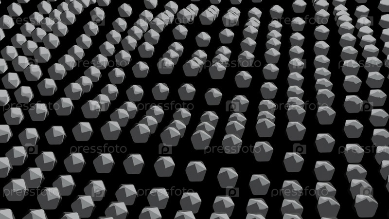 Фон с движущимся серебряным 3D-октаэдром, бесшовная петля. Дизайн. Простые фигуры поля как пульсирующие кольца на черном фоне, монохромные