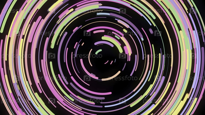 Абстрактная анимация красочно извилистой спирали штрихов. Анимация. Красивая неоновая спираль коротких линий скручивается, как диско-диск на черном фоне