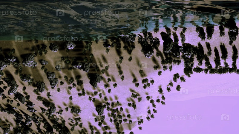 Абстрактный взгляд с воздуха на водорослевой пляж и море, перевернутое вверх дном. Анимация. Летание над песчаным пляжем и бирюзовыми водами