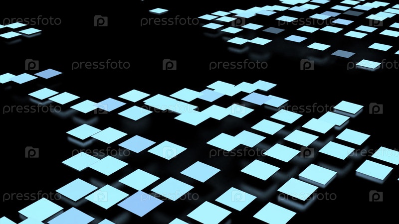 Черный фон. Дизайн. Голубые маленькие квадраты, которые хаотично прыгают в абстракции