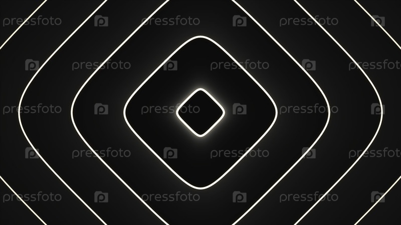 Абстрактный монохромный неоновый ромб фон туннеля.Движение.Белые неонные квадратные силуэты на черном фоне