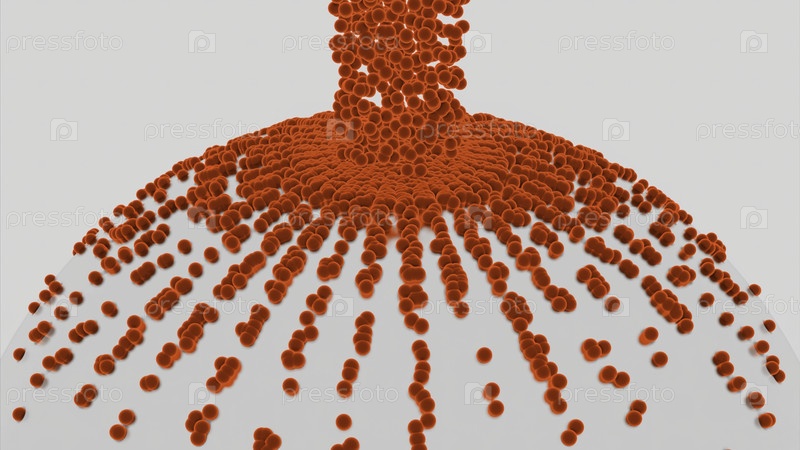 Абстрактный падающий поток крошечных красных шаров на большом прозрачном сферическом силуэте. Дизайн. Красные падающие шарики, качающиеся вниз по сфере на белом фоне