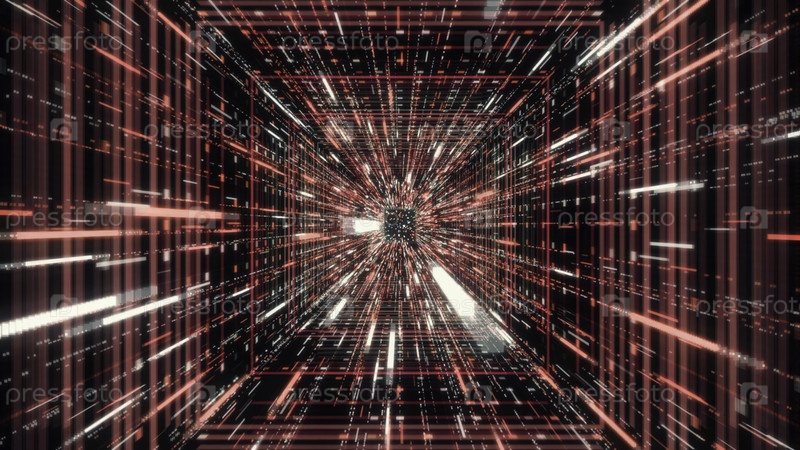 Гипнотическая абстрактная анимация голографического коридора или тоннеля с неоновыми геометрическими узорами и линиями, движущимися на черном фоне