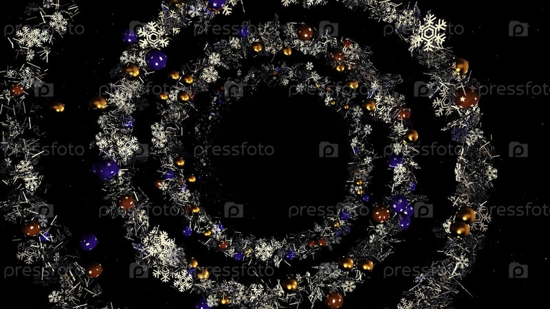 Рождественский или новогодний венок спираль вращается на черном фоне, бесшовная петля. анимация. абстрактные голубые гирлянды снежин и украшения рождественской елки