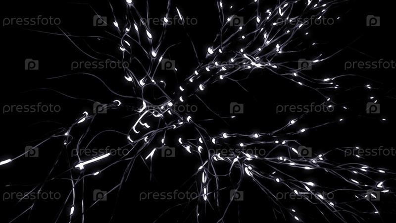 Линии нейронных соединений с яркими импульсами. Дизайн. Сеть нервных линий с мигающими импульсами. Движение световых импульсов по линиям нейронов
