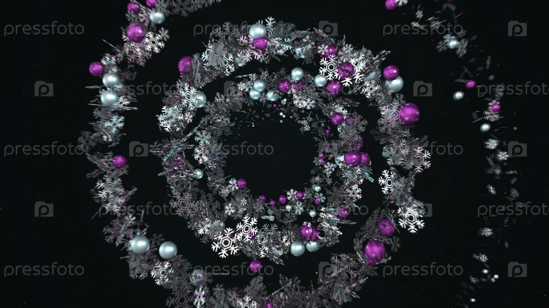 Удивительная абстракция красивых снежин, украшенных многоцветными блестящими шарами и вращающихся по спирали на темном фоне