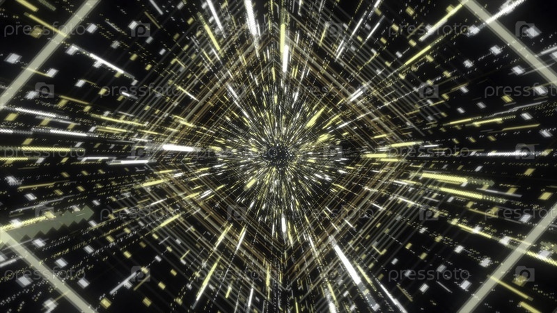 Гипнотическая абстрактная анимация голографического коридора или тоннеля с неоновыми геометрическими узорами и линиями, движущимися на черном фоне