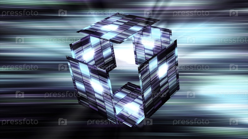 Абстрактный трансформирующийся 3D куб из синей и бирюзовой плитки.Движение.Светлый полосатый движущийся фон с 3D-фигурой, бесшовная петля