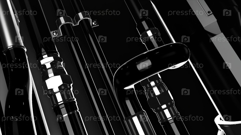 Футуристическая сверхдетальная машина с металлическим блеском изогнутых труб.Движение.Инопланетные космические технологии с частями внеземного механизма