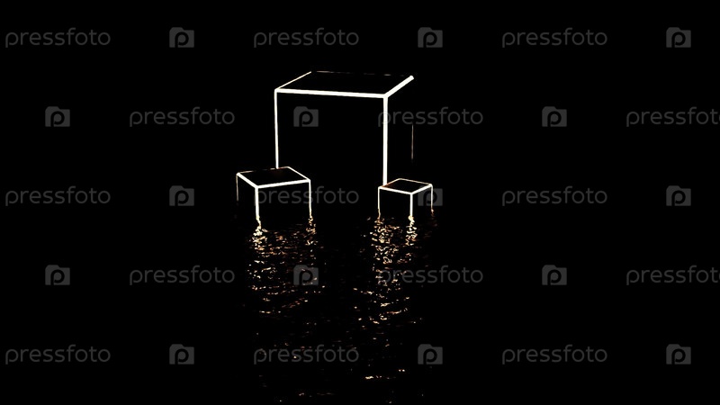 Абстрактные 3D-силуэты небольших и больших кубиков, изолированных на черном фоне. Дизайн. Неоновая рама кубов, стоящих на жидкой поверхности