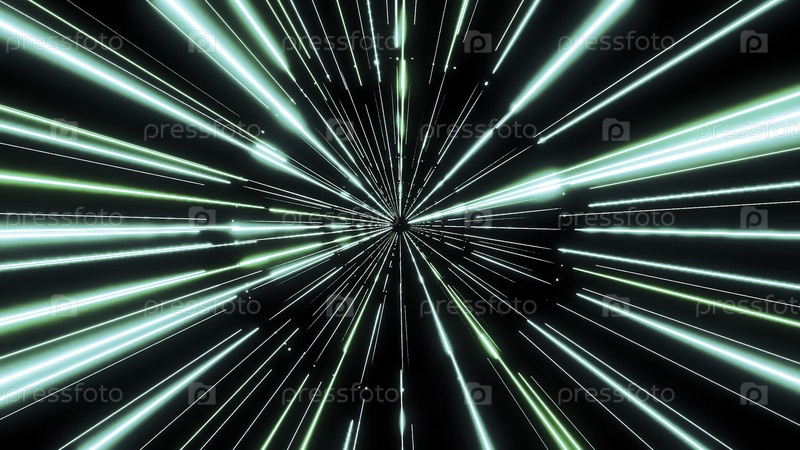 Тунель ярких лучей в киберпространстве Дизайн Яркие неоновые линии перемещаются к центру на черном фоне Космический туннель неонных лучей