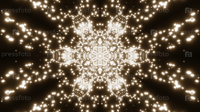 Калейдоскоп светящихся летающих звезд. Дизайн. Пульсирующий орнаментный рисунок с распространением частиц