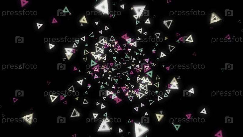Красивое скопление многочисленных разноцветных неоновых треугольников, плавающих в абстрактной среде на черном