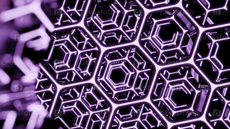 Светящаяся фиолетовая структура шестиугольной сетки, образующая абстрактный футуристический рисунок