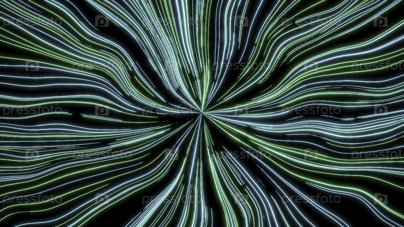 Неоновые линии в перспективе искажены. Дизайн. Неспособность с искажением неоновых централизованных линий. Яркие линии, движущиеся к центру, искажаются волнистыми потоками