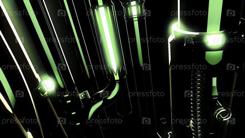 Футуристическая сверхдетальная машина с металлическим блеском изогнутых труб.Движение.Инопланетные космические технологии с частями внеземного механизма