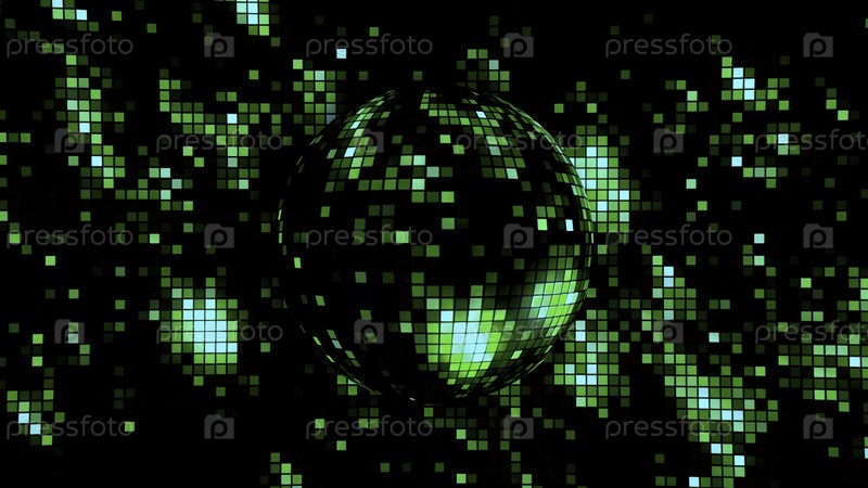 Абстрактный зеленый и черный пиксельный фон с силуэтом вращающейся сферы. Движение. Сверкающий рисунок красочных частиц, плавная петля