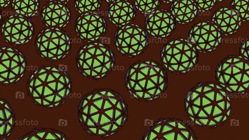 Абстрактное вращение шаров или сфер на фоне контрастного фона. Дизайн. Футуристическое техно движение сфер с текстурой сетки