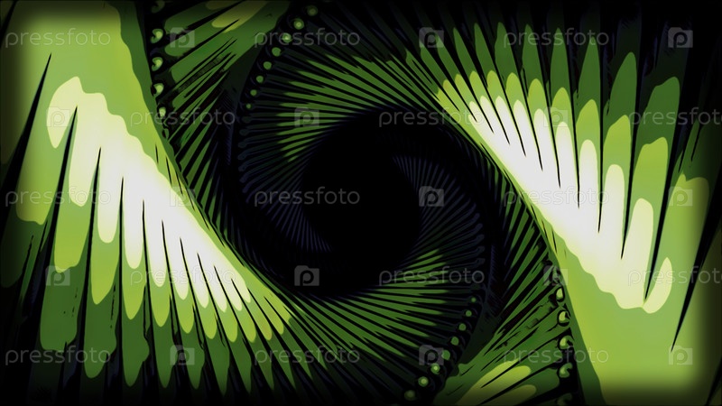 Зелено-серый сетчатый коридор с темнотой внутри. Дизайн. Огромный яркий туннель в абстракции, быстро движущийся изнутри