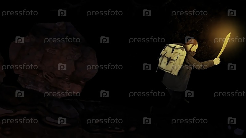 Абстрактная мультфильмовая анимация с храбрым человеком с факелом в лесу.Сцена.Человек, проходящий через препятствия в опасном лесу