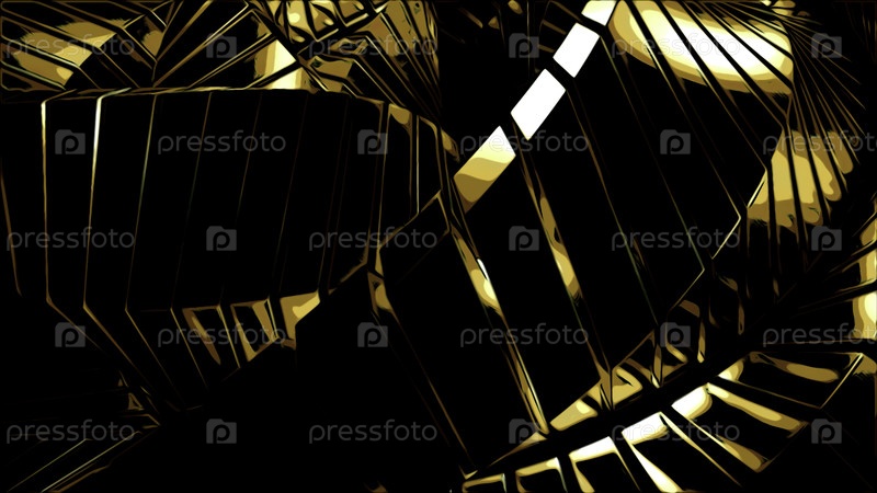 Желтые и серые полосы. Дизайн. Черный фон с полосами, выполненными в 3D-абстракции, которые вращаются