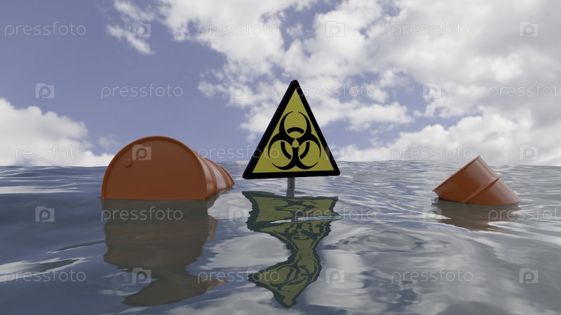 Опасное место. Дизайн. Голубое спокойное море с загрязняющими бочками нефти и знаком опасности, выполненным в компьютерной графике