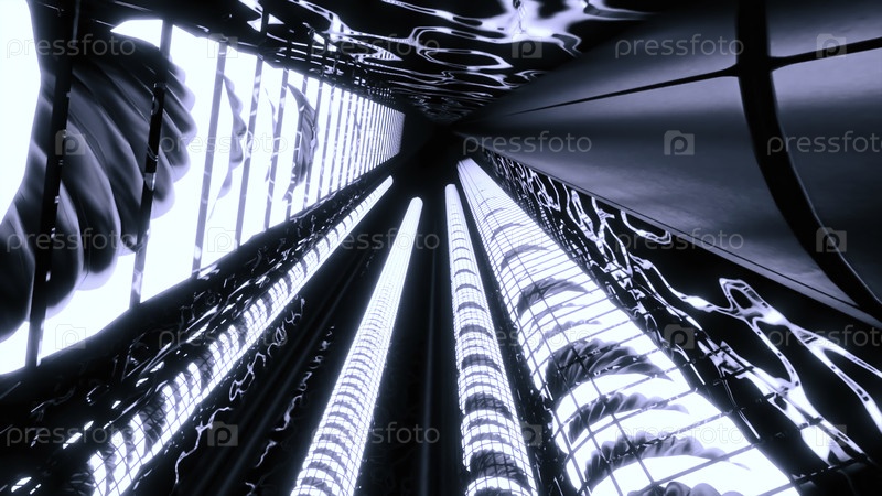 Футуристический 3D-туннель со световыми трубами. Дизайн. Светящийся кибер туннель с 3D-трубами. Темный коридор со светящимися 3D-трубками в футуристическом стиле