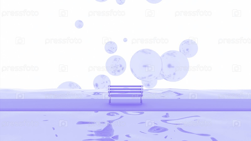 Светлый фон с оранжевым и синим оттенком. Дизайн. Белый фон с 3D-анимацией с небольшой скамейкой и пузырями, которые распространяются вокруг. Высокое качество 4k кадры