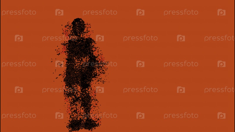Облако черных крошечных частиц собирается в человеческий силуэт, который ходит. Дизайн. Искусственный интеллект или нейронная сеть пытаются создать форму мужчины или женщины
