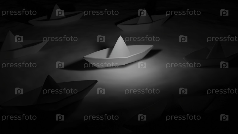 3D бумажные лодки на воде. Дизайн. Бумажные лодки движутся по поверхностным водяным волнам. Множество бумажных лодок на воде на черном фоне