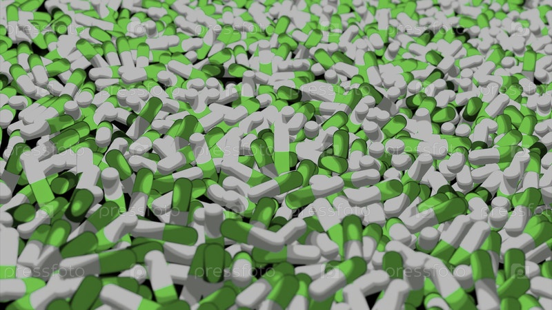 Черный фон с большим количеством таблеток. Дизайн. Яркая анимация, на которой бело-зеленые и розово-белые таблетки выпадают и немного колеблются