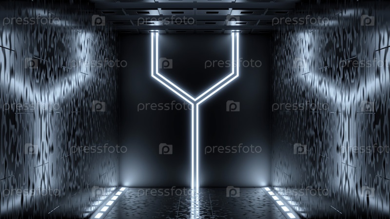 Пролетая по коридору космического корабля.Дизайн.Туннель с металлическими стенами и неоновым освещением